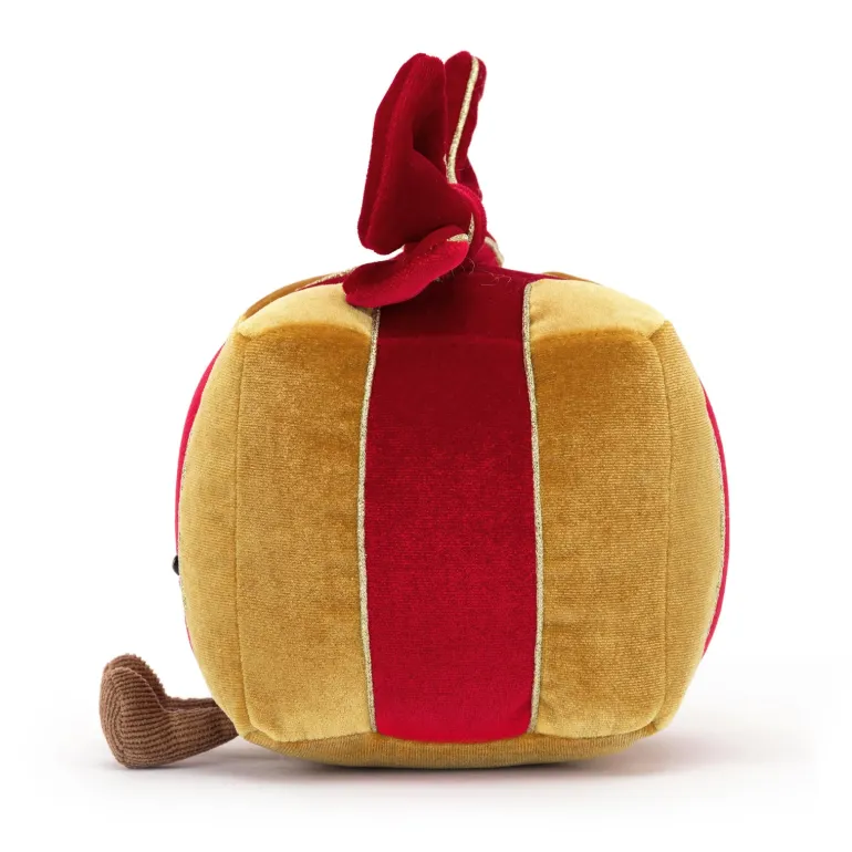 The best part of any gift is always the wrapping! Amuseables Present is a soft golden box with cranberry ribbon edged with gold braid. With a perky ruched bow, a merry smile, a suedette base and kicking cord boots, this present is absolutely correct!