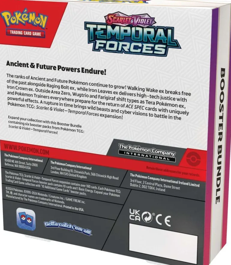 The ranks of Ancient and Future Pokémon continue to grow! Walking Wake ex breaks free of the past alongside Raging Bolt ex, while Iron Leaves ex delivers high-tech justice with Iron Crown ex. Outside Area Zero, Wugtrio and Farigiraf shift types as Tera Pokémon ex, and Pokémon Trainers everywhere prepare for the return of ACE SPEC cards with uniquely powerful effects. A rupture in time brings wild beasts and cyber visions to battle in the Scarlet & Violet—Temporal Forces expansion!