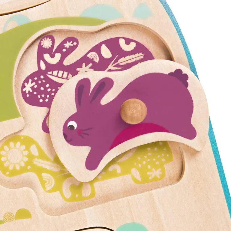 The perfect puzzle for curious little minds! Travel to a sunny farm and discover different animals such as a cow, chicken, horse, and more. Made with smooth and natural wood, this 8-piece puzzle is perfect for little hands – the pegs are easy to grab and the colorful patterns underneath each piece guide your little one to the right spot!