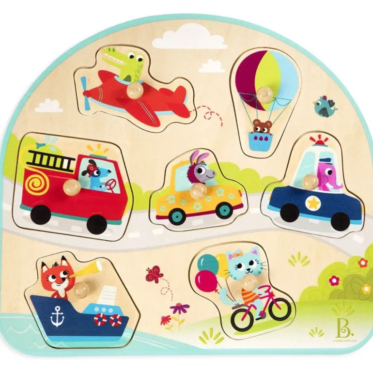 A fire-dog and a flying bear, what’s an alligator doing in the air?! This wooden puzzle lets your curious kiddo discover colorful critters, different vehicles, and even a few professions. Take a ride in a fire truck with a courageous pup, patrol the streets in a squad car with a friendly elephant, or brave the high seas in a ship with an adventurous fox!