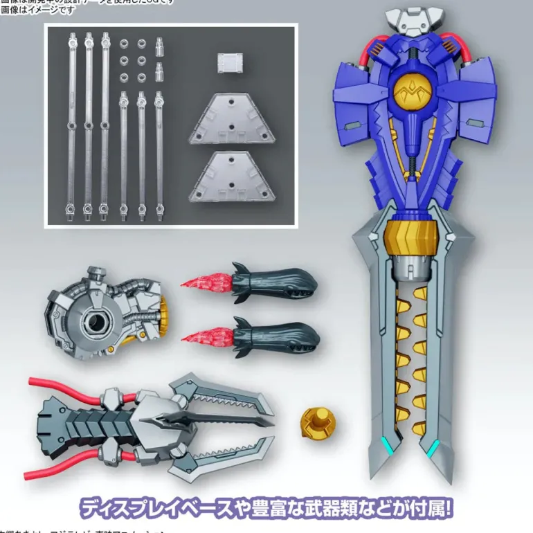 The contrast between its body and machine parts are highlighted thanks to the intricate modeling of the Amplified series; the chest hatch can be opened to launch the Giga Destroyer organic missile. The massive wings mounted to its back use PET sheets with a vivid pattern printed on them; its tail is made to be flexible with internal lead wires. Parts and a display base to show it off in its Alteraus mode are included too, and 3D metallic stickers are also included for extra flashiness! It’s also equipped with connection holes in various places for customization and expansion.