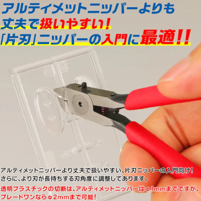 Due to the sharpness of the GH-PN-120 cutting blade, you can obtain a smooth surface with little plastic whitening or gouging and with a minimum of scraping, sanding and polishing. This greatly improves kit construction efficiency, allowing you to speed through assembly steps without those often frustrating hours of sprue gate removal and clean up. The neat cut provided by the GH-PN-120 Blade One Nipper is also perfect for those whom do not wish to paint their model, a feature highly desirable to snap-fit model builders in particular.