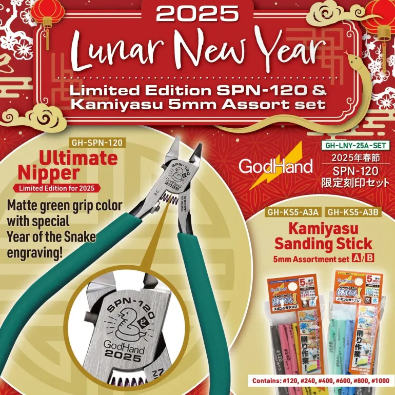 Godhand Lunar New Year set with SPN-120 clippers, and a selection of 3mm sanding sticks.