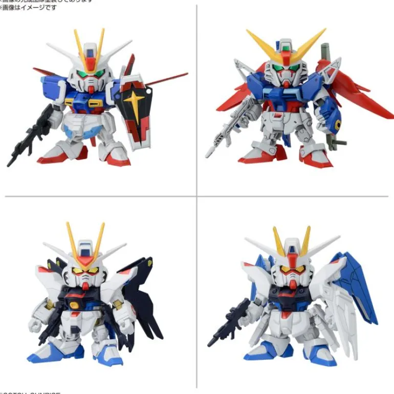 From “Mobile Suit Gundam SEED” and “Mobile Suit Gundam SEED Destiny”, the popular SD Gundams are back as a set: “Freedom Gundam”, “Force Impulse Gundam”, “Strike Freedom Gundam”, and “Destiny Gundam”.