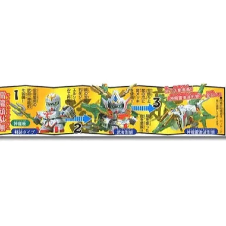 You build the Keisou type. Then you build the Jinryuu Raigekiha Keitai. Put them together and form the Musha keitai mode of Rairyu Gundam. All parts are molded in color including the gold-plated parts for the Kabuto. Marking stickers are also provided.