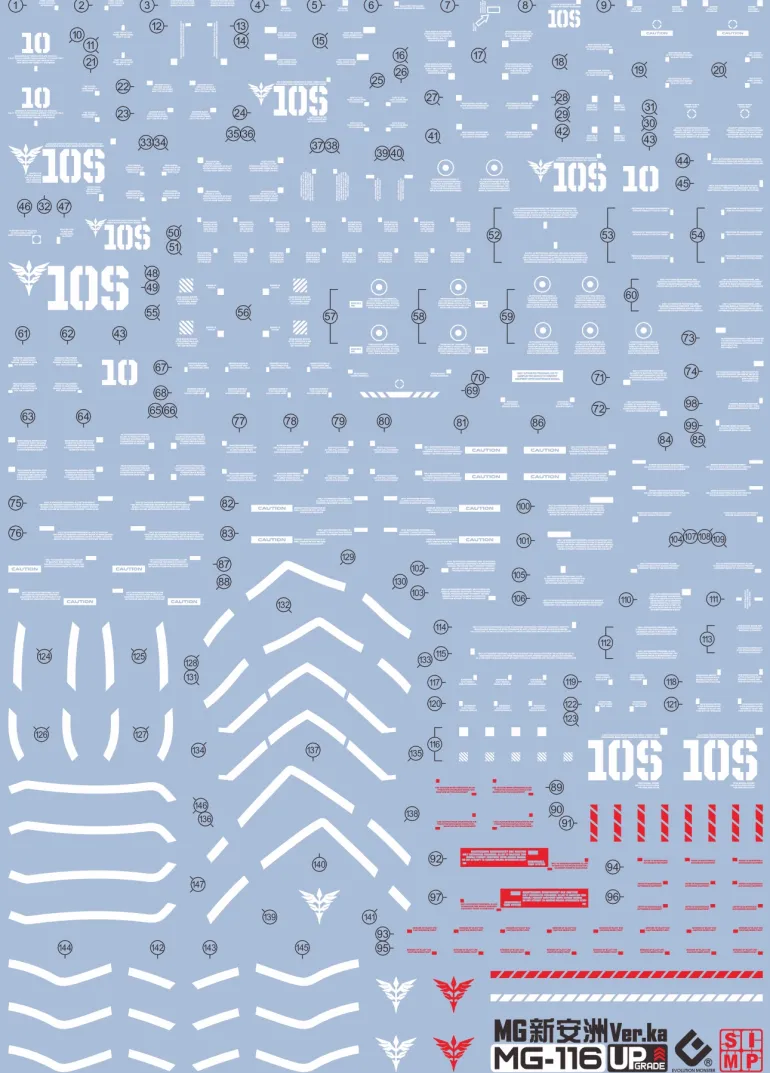 These are high-quality water-slide decals to add custom markings to your 1/100 scale MG Sinanju OVA Ver.KA.