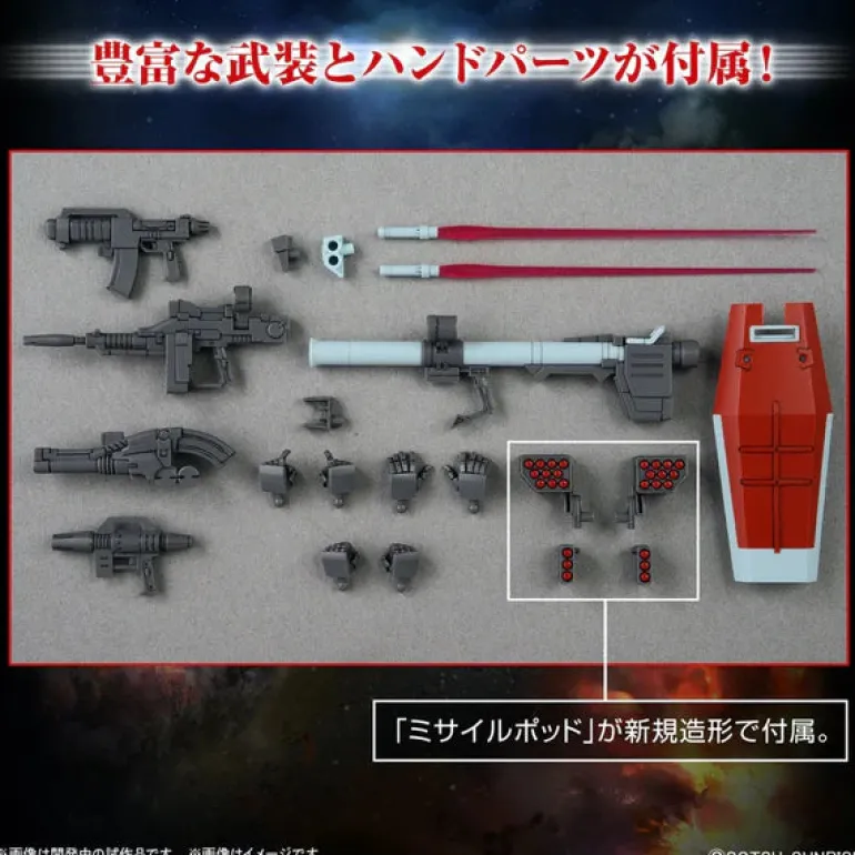 It can be displayed equipped with a shoulder cannon or a missile pod with parts replacement; lots of weapons and interchangeable hand parts are included. The beam saber, Hyper Bazooka and saber rack can be attached to its rear skirt, and original marking stickers designed by Hajime Katoki are also included!