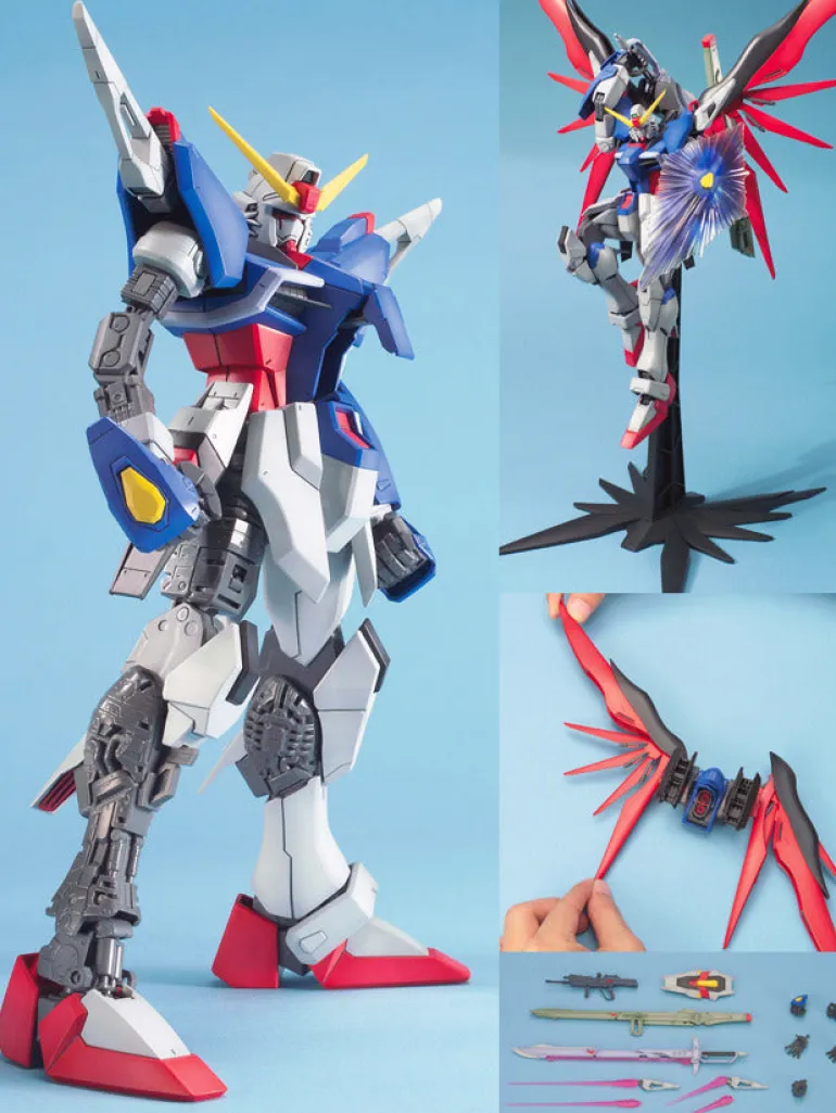 Based on the Gundam Seed Destiny anime, the Destiny Gundam model kit is in 1/100 scale and becomes a fully articulated figure once complete. Destiny Gundam comes with all armaments: anti-ship sword, launcher gun, beam rifle, shield, beam boomerang, beam saber, and palm cannon parts. A display stand is also included.