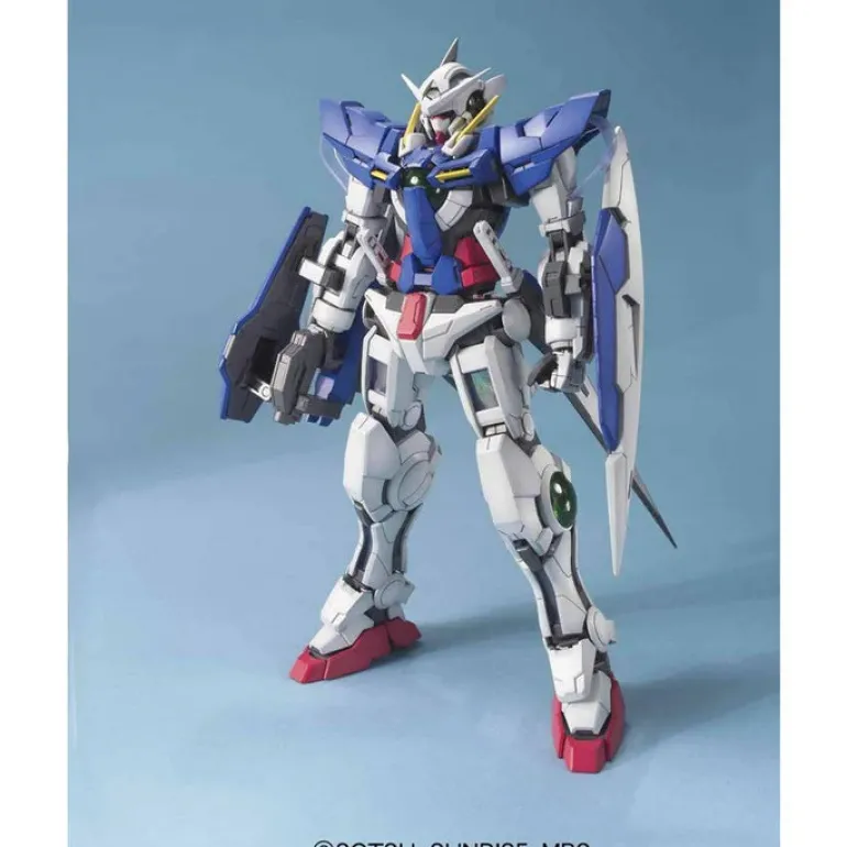 Its complete Seven Sword System is provided consisting of a GN Long Blade, a GN Short Blade, two GN Beam Daggers, two GN Beam Sabers, a GN Sword that can switch between rifle mode and gun mode, plus a GN Shield with sides that can slide out. A dedicated clear base is also included for displaying the detachable GN Drive, and a red cover part can be attached to the back of Gundam Exia in place of the GN Drive. Two same-scale figures (molded in white) of Setsuna in standing and sitting poses are packed in the set along with foil stickers, dry transfer stickers, and MG Gundam Exia original marking stickers for detail.
