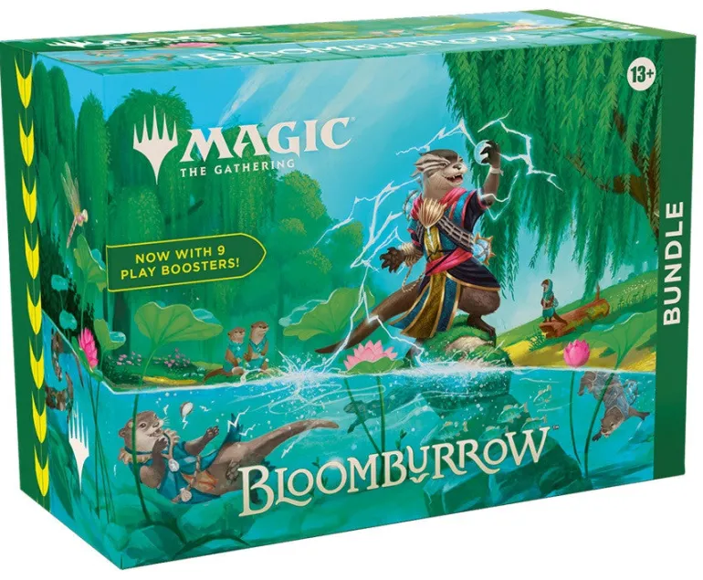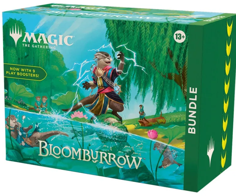 - BUNDLE CONTENTS—9 Bloomburrow MTG Play Boosters, 1 Traditional Foil alt-art card, 30 Land cards (15 foil, 15 nonfoil), 1 Spindown life counter, 1 card storage box, and 2 reference cards.