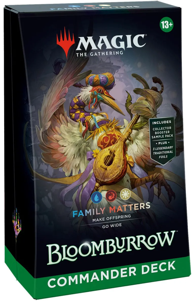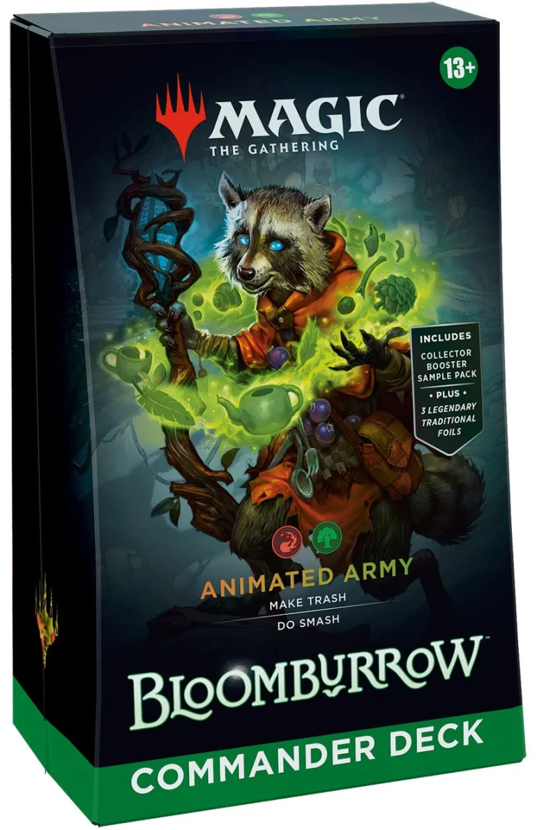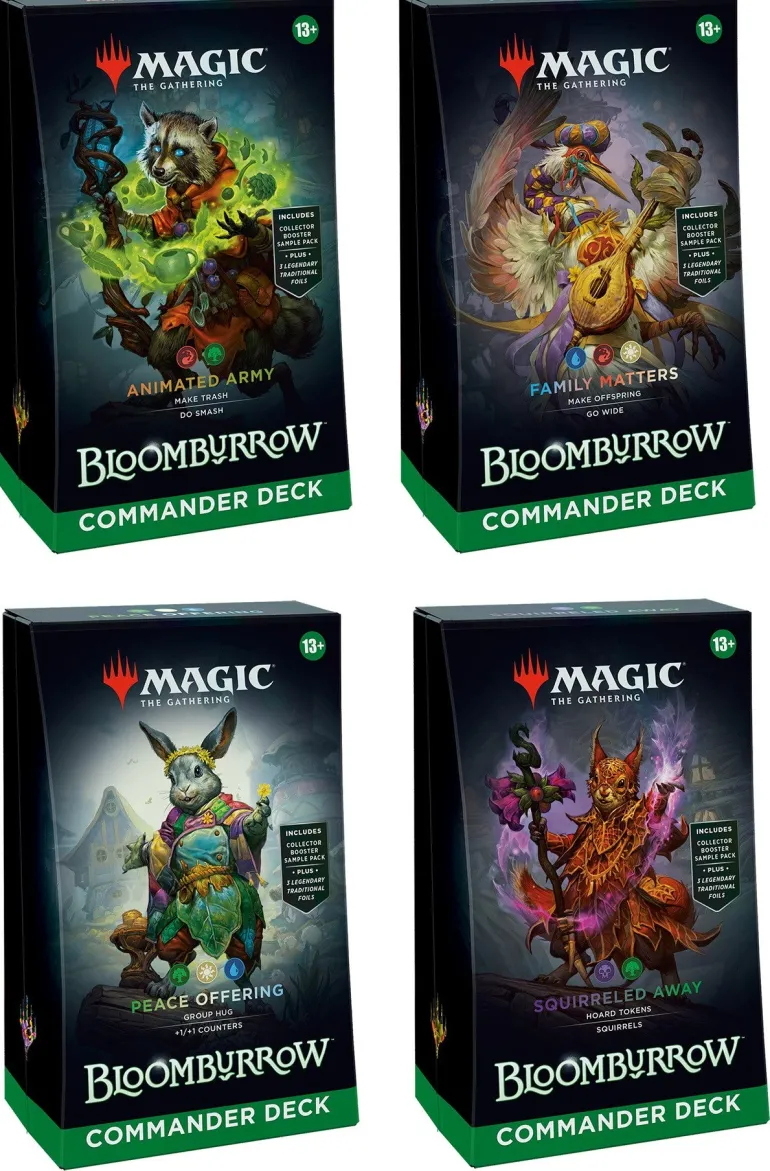 - GET ALL 4 BLOOMBURROW COMMANDER DECKS—Make trash and smash with Animated Army, make offspring and go wide with Family Matters, make friends, and then end them with Peace Offering, or hoard tokens to defeat your enemies with an army of squirrels with Squirreled Away