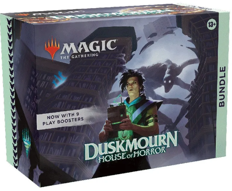 When you’re trapped in the endless halls of Duskmourn, the only way out is through. Band together with plucky survivors and battle your way to the heart of the House. This Duskmourn: House of Horror Bundle contains 9 Duskmourn: House of Horror Play Boosters, plus 1 Traditional Foil card with Bundle-exclusive alternate-art, 15 Traditional Foil and 15 nonfoil Land cards (including 5 foil and 5 nonfoil Full-Art Lands), 1 oversized Spindown life counter, 1 card storage box, and 2 reference cards. Each Play Booster contains 14 Magic: The Gathering cards, including 1–4 cards of rarity Rare or higher and at least 1 Traditional Foil card.