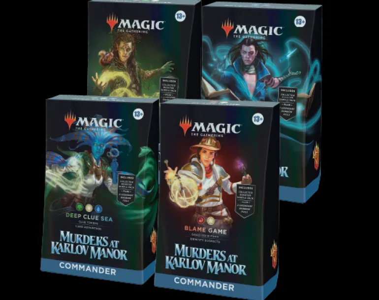- INTRODUCING 45 COMMANDER CARDS—Get all 4 Murders at Karlov Manor decks for a total of 45 never-before-seen Magic: The Gathering cards (11 unique to each deck + 1 found in all 4), including 8 foil Legendary Creature cards