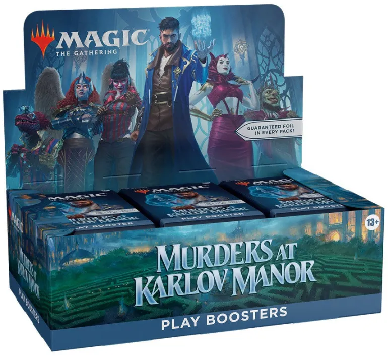 A series of shocking murders involving some of Ravnica’s most powerful citizens has the city on the verge of chaos. Now detectives are on the case . . . and you’re one of them. Return to the fan-favorite plane of Ravnica in Murders at Karlov Manor, Magic’s unique take on the murder mystery genre. This Murders at Karlov Manor Play Booster Box contains 36 Play Boosters, perfect for both Limited play and opening packs just for fun. Each Play Booster contains 14 Magic: The Gathering cards and 1 Token/Ad card, Suspect Punchout card, or Art Card. (Regular Art Card found in 30% of packs. Foil-stamped Signature Art Card in 5%.) Every pack includes a combination of 1–4 cards of rarity Rare or higher and 3–6 Uncommon, 6–9 Common, and 1 Land cards (Full-Art Land in 33% of packs). One card of any rarity is Traditional Foil. The Land card is also Traditional Foil in 20% of boosters, and a special bonus card from Magic’s history can be found in 12% of boosters. Rulebook not included.