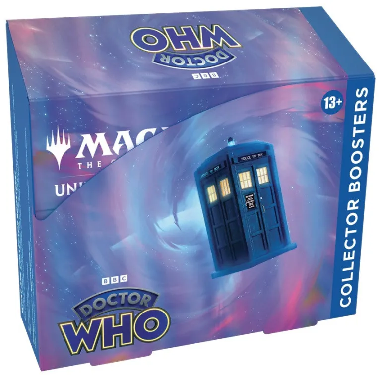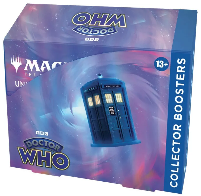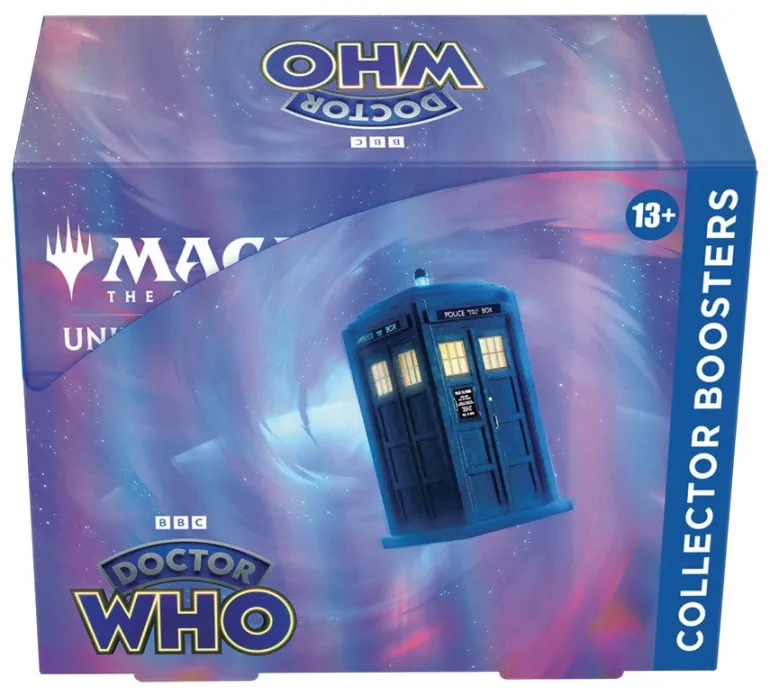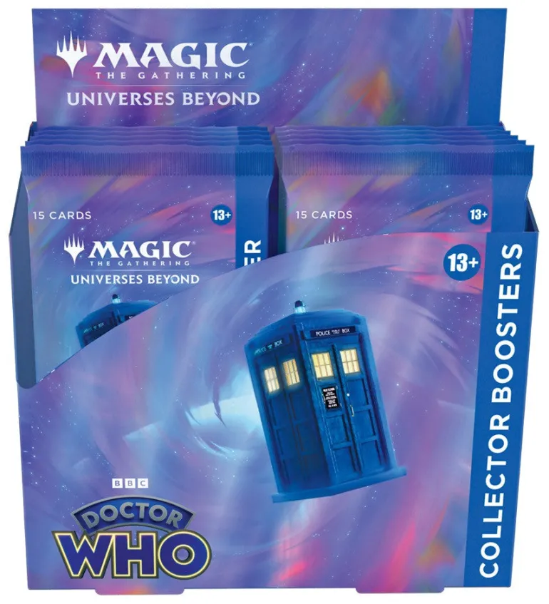 This Doctor Who Collector Booster Box contains 12 Doctor Who Collector Boosters. Each booster contains 15 Magic: The Gathering cards, with a total of 12 foil cards (3–10 Surge Foils and 2–9 Rainbow Foils) and 1 Surge Foil or Traditional Foil double-sided token. Every pack includes a combination of 7–14 cards of rarity Rare or higher and up to 7 Uncommon, up to 5 Common, and 1 Land cards.