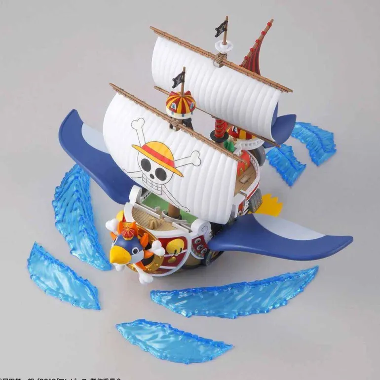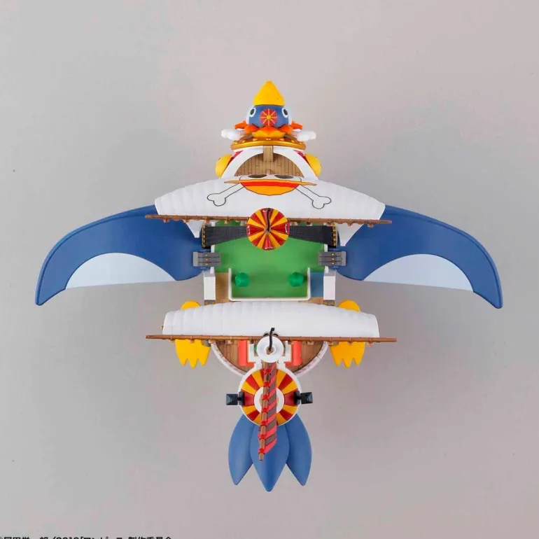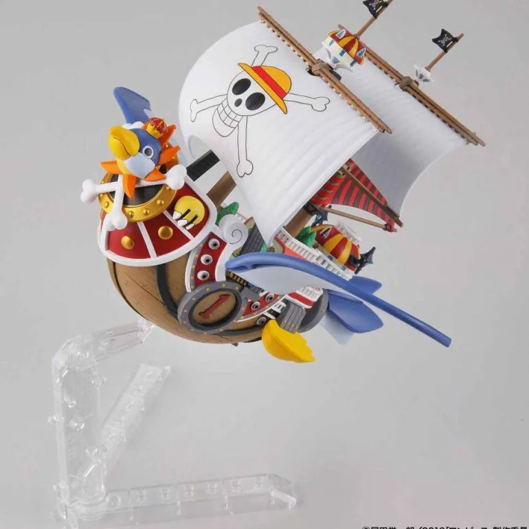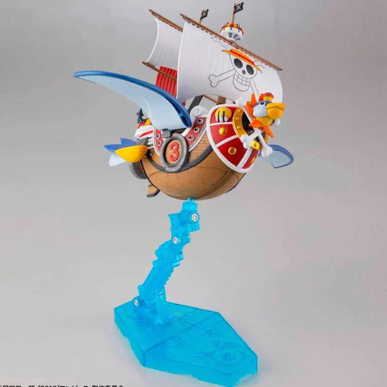 This is a model kit of the ship Thousand Sunny as it appears in the anime film One Piece Stampede! It features new Emperor Penguin themed parts that allow it to soar! Included are additional water effect parts to display it on the sea or a clear stand to make it appear flying.