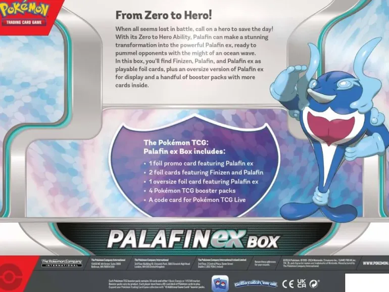 In this box, you’ll find Finizen, Palafin, and Palafin ex as playable foil cards, plus an oversize version of Palafin ex for display and a handful of booster packs with more cards inside.