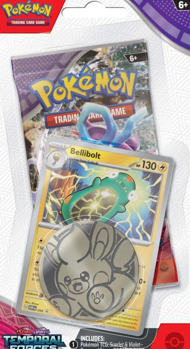 The ranks of Ancient and Future Pokémon continue to grow! Walking Wake ex breaks free of the past alongside Raging Bolt ex, while Iron Leaves ex delivers high-tech justice with Iron Crown ex. Outside Area Zero, Wugtrio and Farigiraf shift types as Tera Pokémon ex, and Pokémon Trainers everywhere prepare for the return of ACE SPEC cards with uniquely powerful effects. A rupture in time brings wild beasts and cyber visions to battle in the Scarlet & Violet—Temporal Forces expansion!
