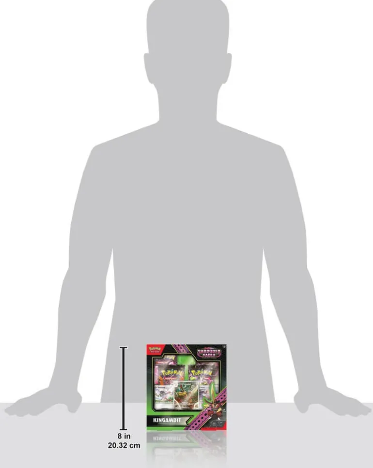 Kingambit overcomes all challengers to become the leader of its own army! With this noble collection, you can add the Big Blade Pokémon to your team as an illustration rare-style promo card, joined by foil cards featuring Pawniard and Bisharp. You’ll also find four booster packs from the special Scarlet & Violet—Shrouded Fable expansion!