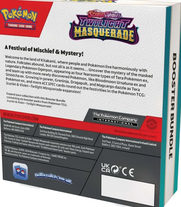 Welcome to the land of Kitakami, where people and Pokémon live harmoniously with nature. Folktales abound, but not all is as it seems… Uncover the mystery of the masked Legendary Pokémon Ogerpon, appearing as four fearsome types of Tera Pokémon ex, and team up with more newly discovered Pokémon, like Bloodmoon Ursaluna ex and Sinistcha ex. Growing in power, Greninja, Dragapult, and Magcargo dazzle as Tera Pokémon ex, and more ACE SPEC cards round out the festivities in the Pokémon TCG: Scarlet & Violet—Twilight Masquerade expansion!
