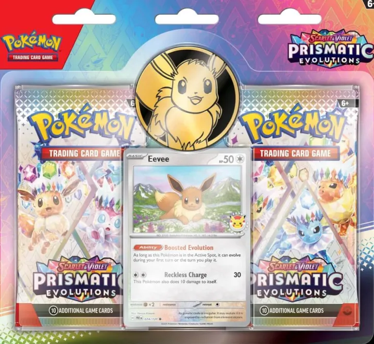 Expand your collection with a foil Pokémon TCG card featuring Eevee with a Pokémon Day 2025 logo! You also get a metallic coin, two booster packs from the special Pokémon TCG: Scarlet & Violet—Prismatic Evolutions expansion, and a code card for Pokémon TCG Live!