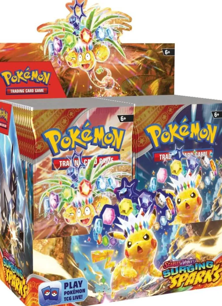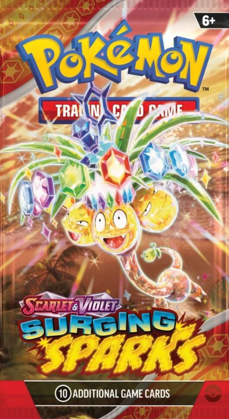 Terawatts of electricity crash down from the sky in a tropical paradise, setting the stage for the supercharged Pikachu ex! With the power of a Stellar Tera Pokémon ex, it lights up the shoreline, revealing a parade of dragon Pokémon led by the towering Alolan Exeggutor ex! Archaludon ex and Latias ex round out the horde, while new ACE SPEC cards and more new Pokémon ex bring surprises of their own. Currents crackle and dragons roar in the Pokémon TCG: Scarlet & Violet—Surging Sparks expansion!