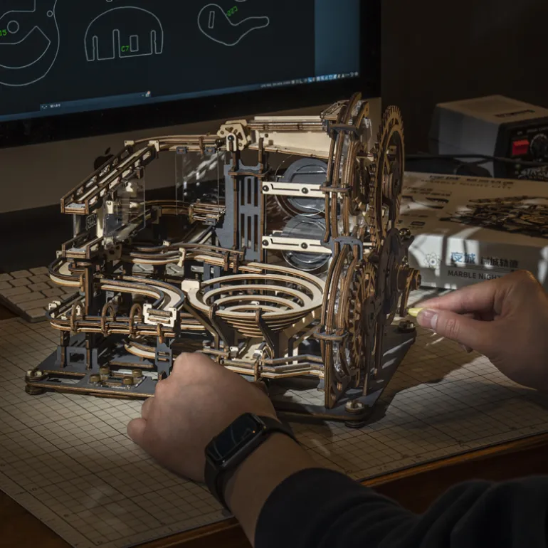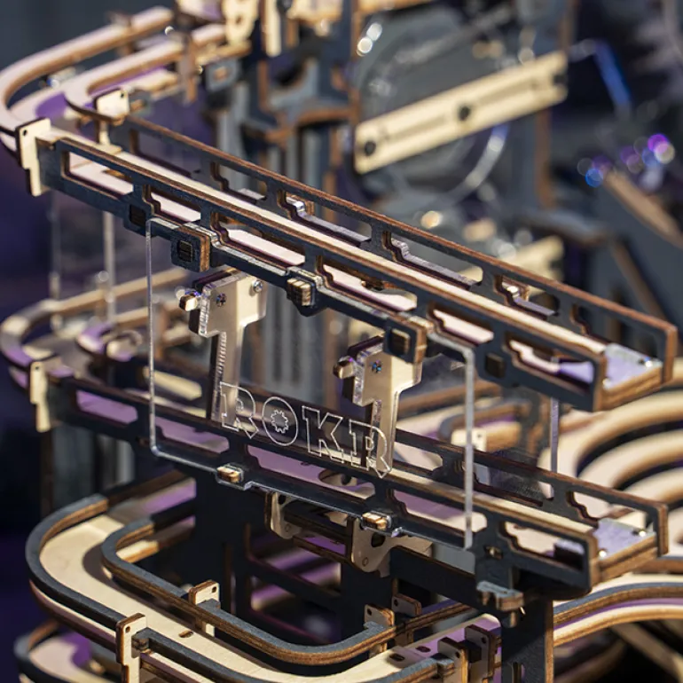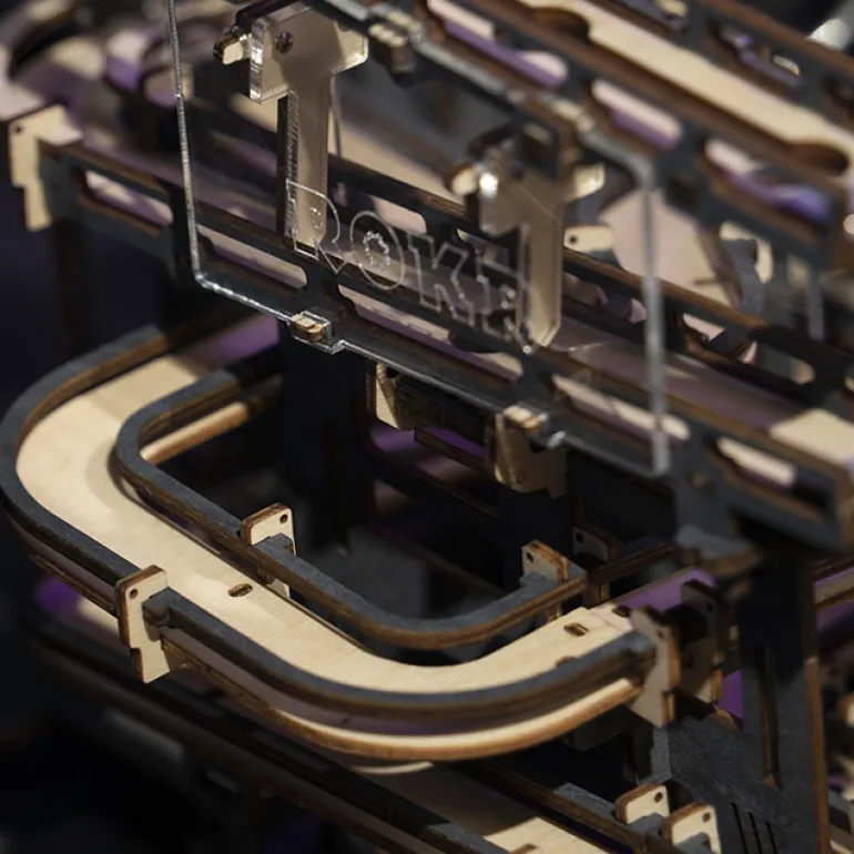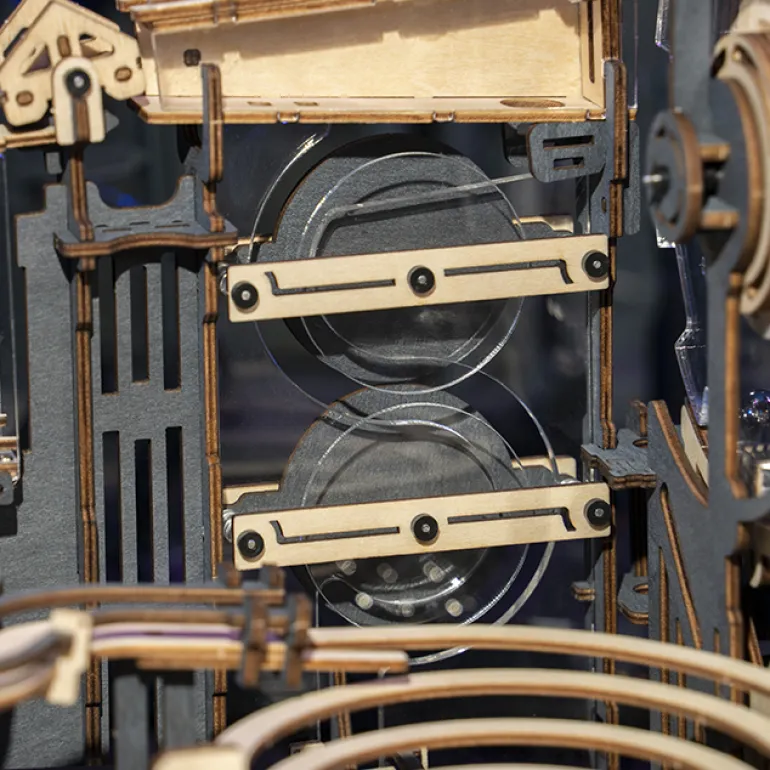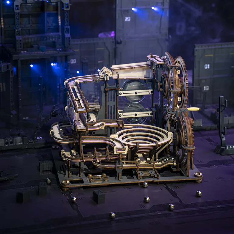 This “night city” takes “future technology” as the creative source and orbital ball as the carrier to show the rigid mechanical structure to the public and feel the order pleasure of steel ball rolling. This product adopts a wood grain dip dyeing process and metal screen printing technology to dye the wood board with high-grade gray-black while retaining the original wood grain, giving it metal texture and an overall profound future style. High permeability acrylic materials are innovatively added to achieve the “suspended” track effect to show more transparent expressiveness. In terms of playing method, the traditional mortise and tenon technology and gear transmission combination are adopted so that the trackball can operate without power. More tracks are added so players can stimulate brainstorming, feel the precision engineering structure, and experience pure mechanical beauty.