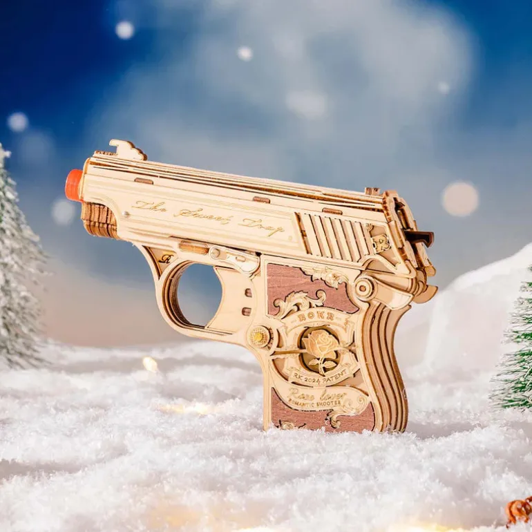 It’s another rousing ROKR adventure with the Justice Guard, a handy mini-gun you can build and play with. Designed to be discreet yet accurate, this semi-automatic pistol serves up action-packed quests with its precise aim and safe rubber band bullets.Building the Justice Guard Mini Gun is a unique, hands-on experience that strikes the perfect balance between challenge and enjoyment, featuring functional mechanical movement and an impressively authentic, detailed look. This toy is not just something to be enjoyed but an educational piece to be relished. Made of POM (a high-performance plastic with low friction properties), the detachable ammo cartridge and movable trigger provide a smooth-sliding effect and audible click that simulates a real handgun. You’ll almost forget that it’s a 3D wooden puzzle!