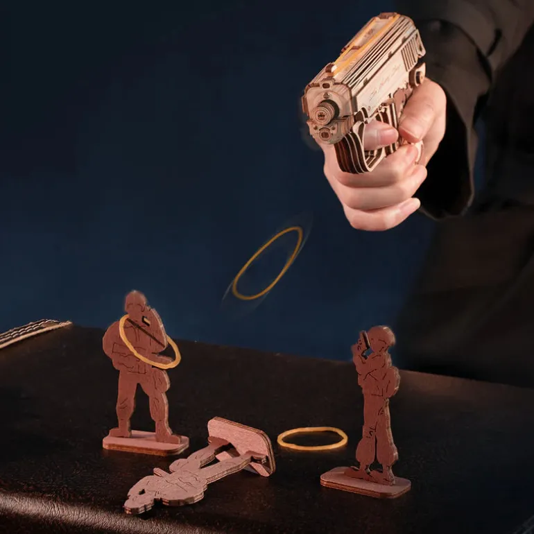 The Justice Guard Mini Gun is a sleek, compact pistol that feels so real you won’t believe it’s a 3D wooden puzzle. This semi-automatic sidearm features a smooth action reset, detachable ammo cartridge, rubber band bullets, and an intricately carved design.