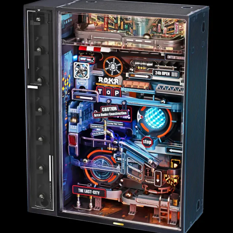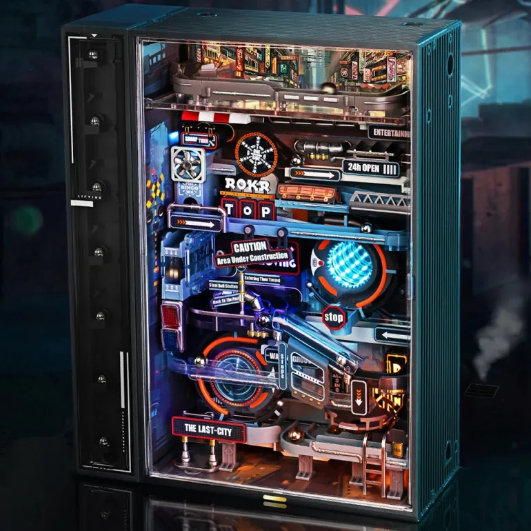 ROKR The Last City features a mesmerizing staircase that automatically elevates metal balls in perfect synchronized fashion, resembling a disciplined army marching into the futuristic cityscape.