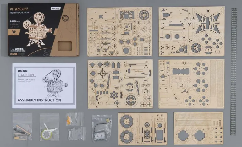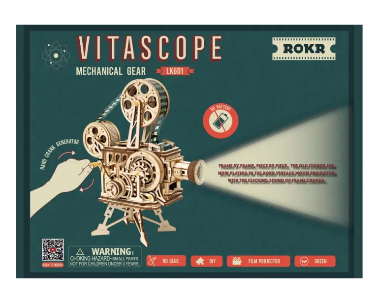 Robotime-ROKR DIY movie projector Vita scope LK601 can play movie for real! Classic design with hand crank generator, it will satisfy movie lovers both in crafting and playing. Put the mechanism together piece by piece, and put on the black & white film. Enjoy a cinema together with friends and family!