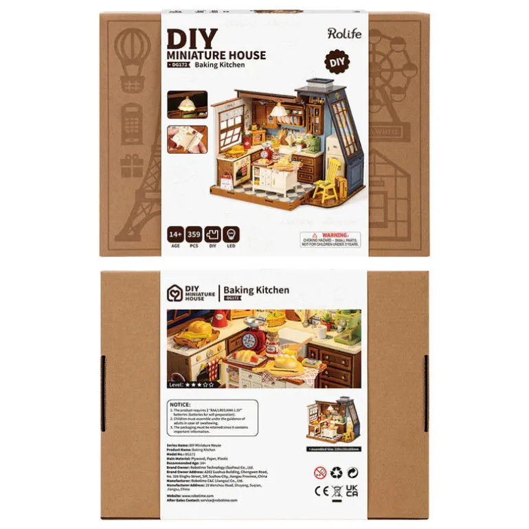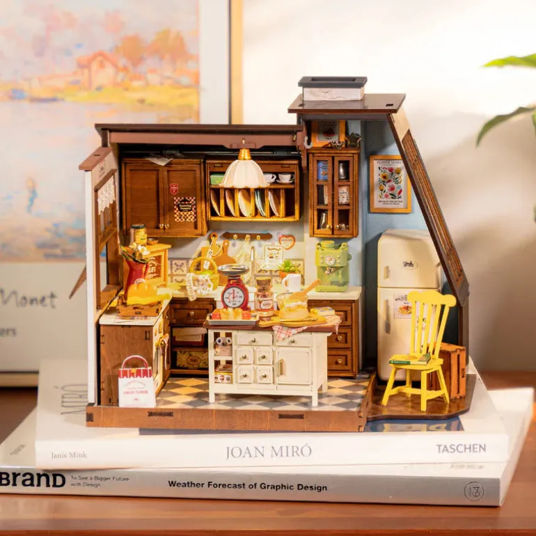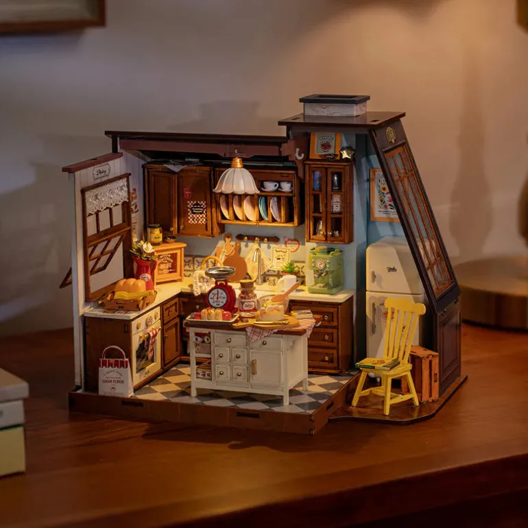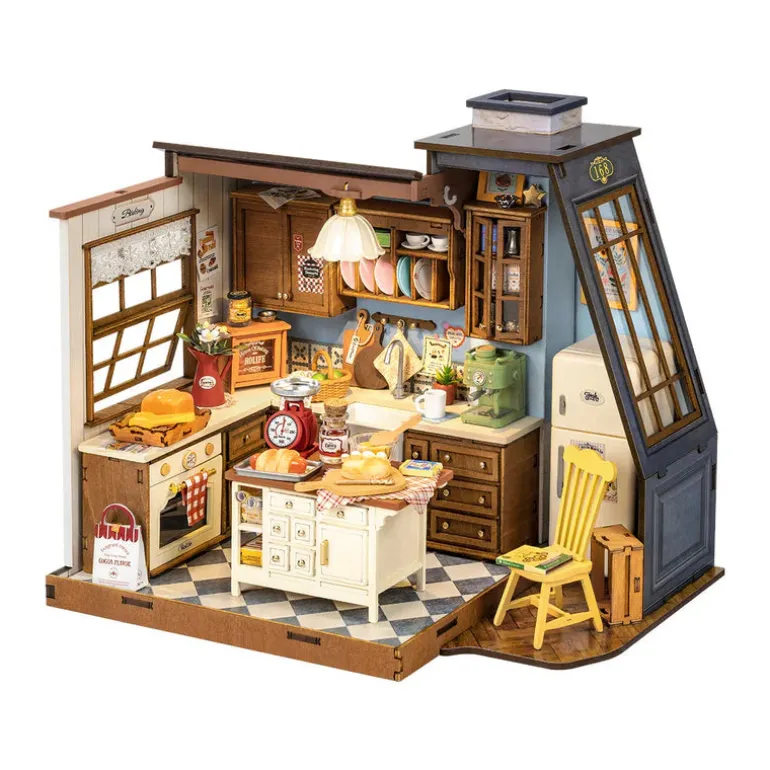 Rolife presents the fun and engaging Baking Kitchen! This DIY miniature house has everything you need to satisfy your craving for a cozy culinary escape: scrumptious details, interactive and functional parts, and the warmth of home. Feast your eyes on charming kitchen essentials like built-in wooden cabinets, an old-fashioned weighing scale, a coffee machine, gleaming white countertops, and a vintage yellow chair. Enjoy the large windows—one featuring a European-style sloped glass panel and the other with a curtained awning—allowing those luscious aromas to drift through the neighborhood.