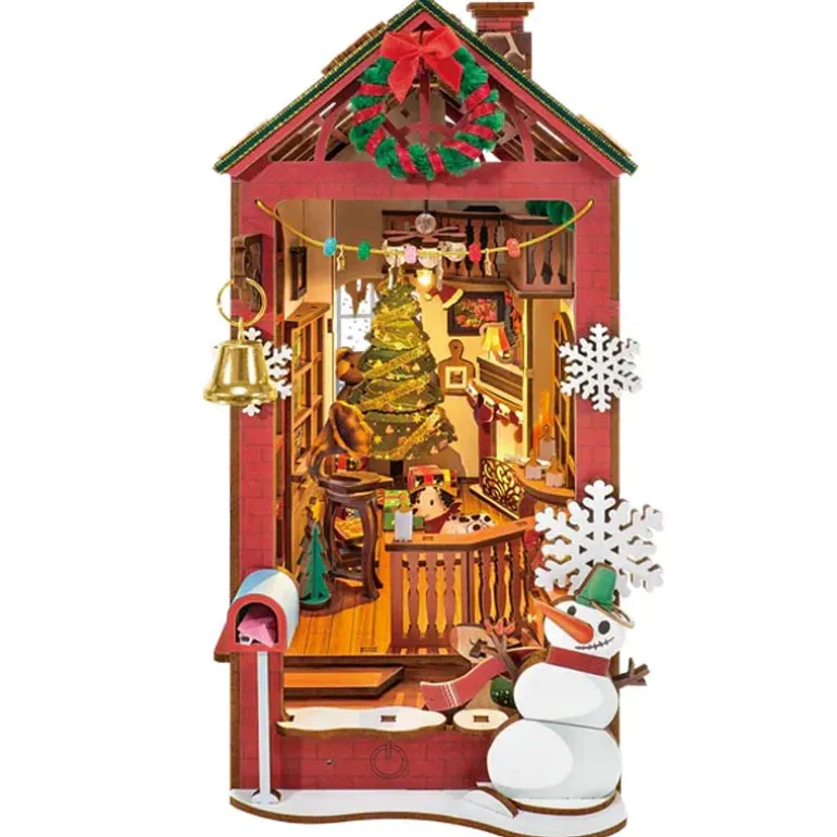 As you assemble this book nook, you’ll be immersed in a homely scene full of charm: a room illuminated by the soft glow of a fireplace, a lovingly decorated Christmas tree, and small decorations that evoke the joy of the holidays. Meticulous details, like wreaths, wrapped gifts, and stacked books, create a warm and magical atmosphere—perfect for those who love cozy, detail-rich environments.