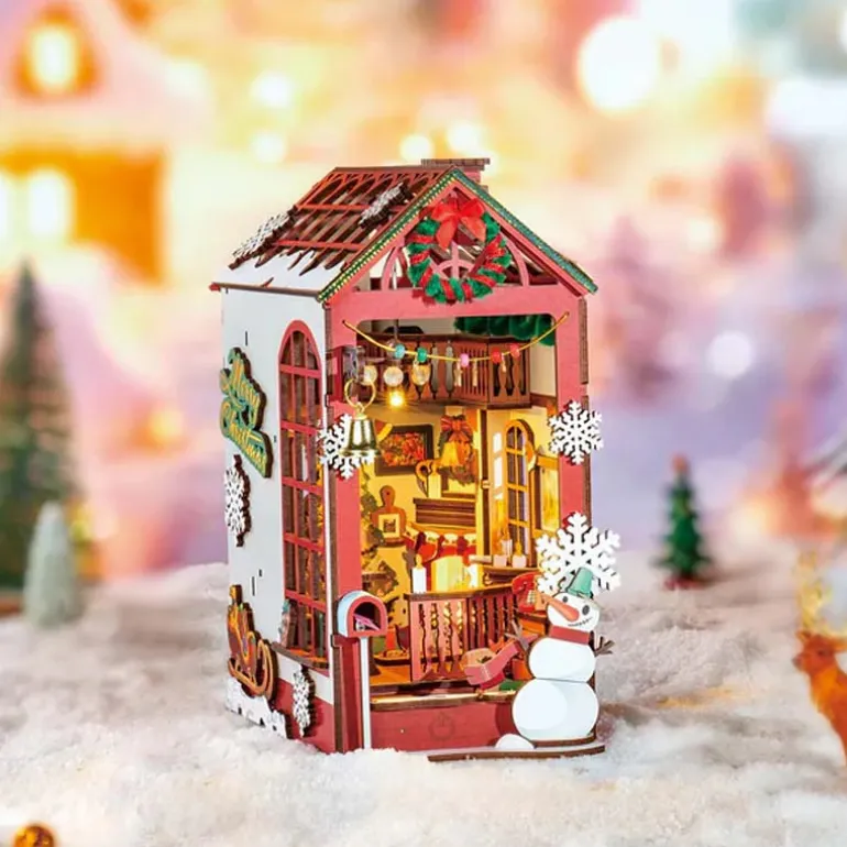 The Book Nook Christmas Indoor Scene is a charming gateway into the magic of Christmas, designed to transport you to a warm and cozy holiday corner. This miniature building kit recreates the essence of the festive season, with details so precise and nostalgic that they seem straight out of a winter fairy tale.