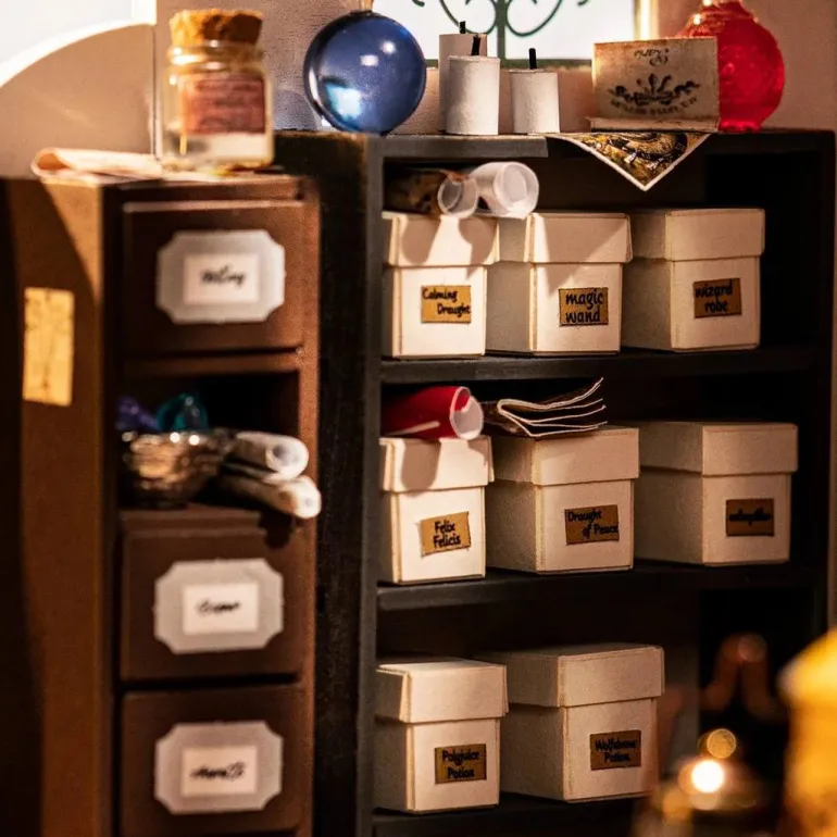 Rolife Kiki’s Magic Emporium DG155 is a mysterious DIY Miniature House from the Mystic Archives Series. Combined with the classic color scheme and elements, the designer created a store for the innocent and cute little witch Kiki after she became a solo operator. There are broomsticks, magic books, crystal balls, pharaoh’s eyes, magic potions, and more. People come here with their own wishes, and what they need to pay for is a secret they have hidden in their hearts. Enjoy building & playing with this DIY dollhouse!