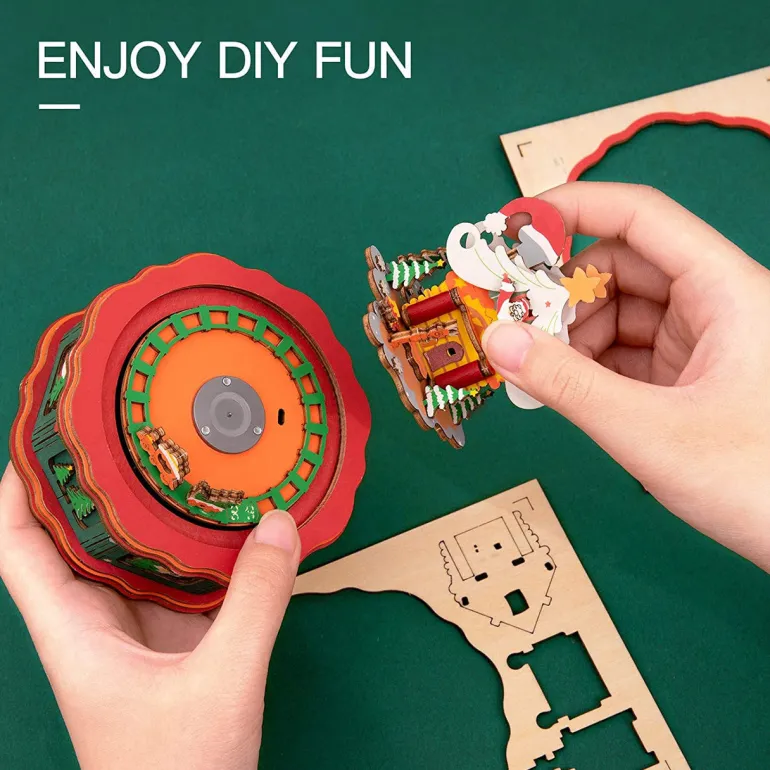 The Robotime Christmas Town Music Box Kit features original design and exquisite laser-cutting technology. Each wooden board requires 12 screen printings to make a full color transparent pattern. After assembly, rotate the spring to enjoy the music – “Sakura.” Music box includes a high-quality serinette movement for crisper music.