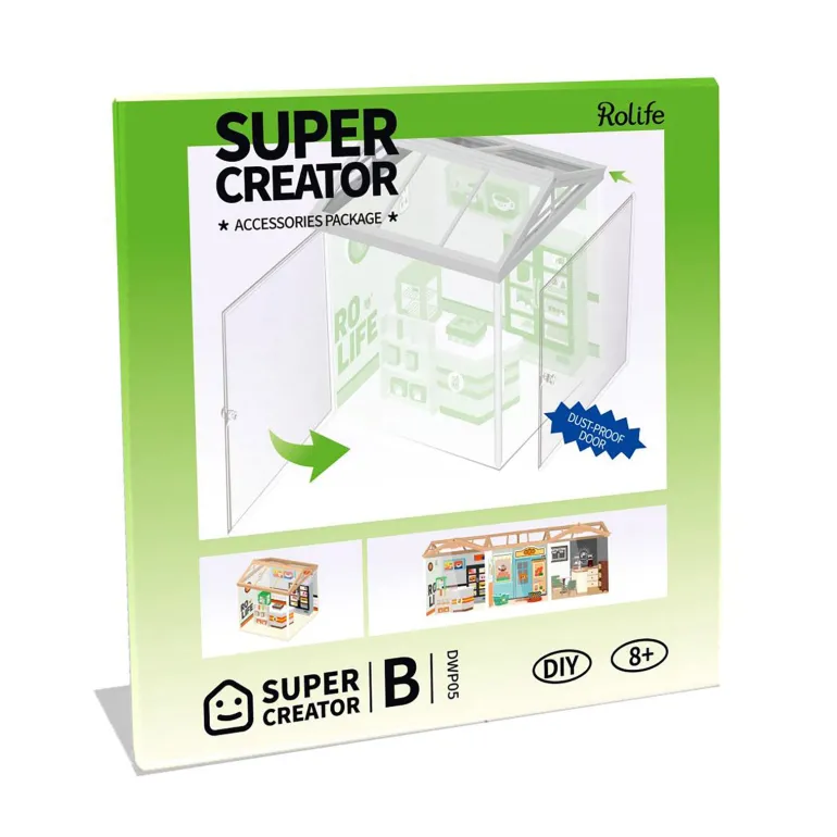 This product is an accessory and works for Rolife Super Creator series only. Typically, a Rolife Super Creator miniature house can combine with a roof and two dust-proof doors.