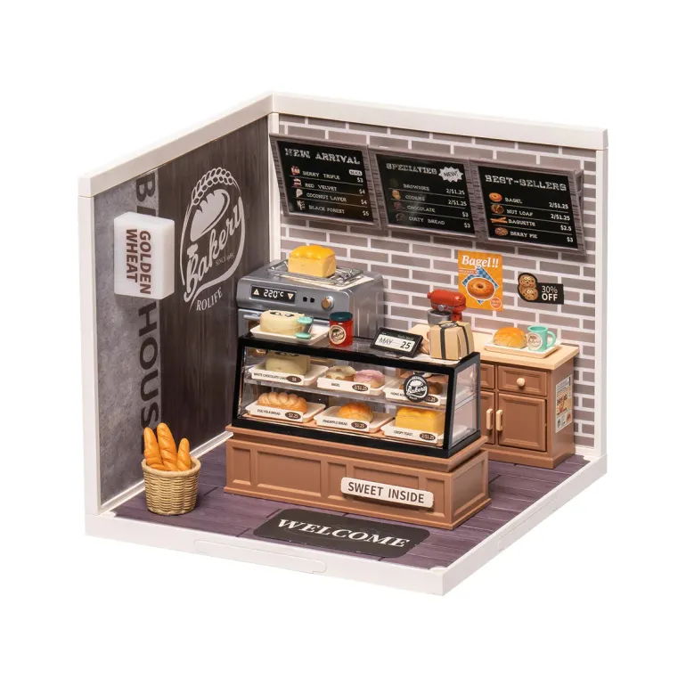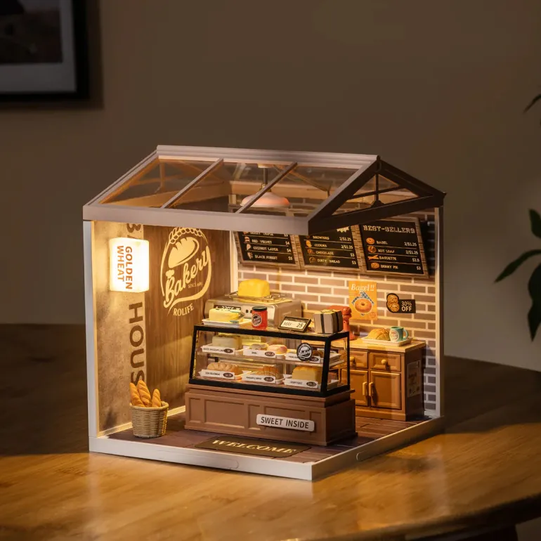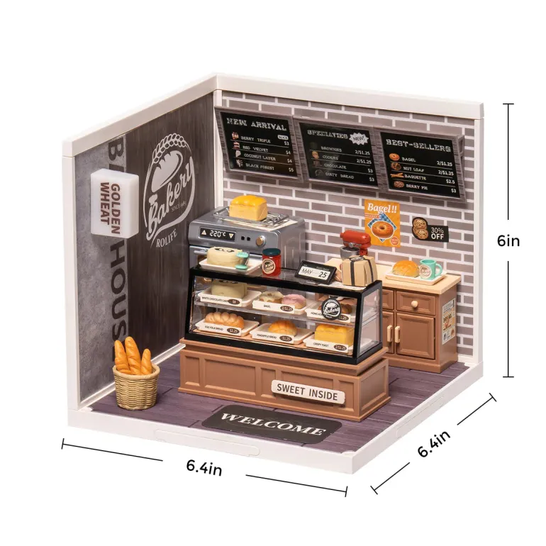 Golden Wheat Bakery DW005 is a DIY plastic miniature house rom Rolife Super Creator – Super Store Series. This adorable bakery offers fresh and tasty bread and dessert that you’ll love, especially our signature bagels, berry tarts and white cake, which are popular among our customers. You don’t want to miss it! Have fun building & playing with this amazing bakery store miniature dollhouse!