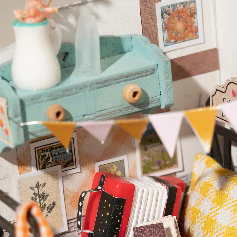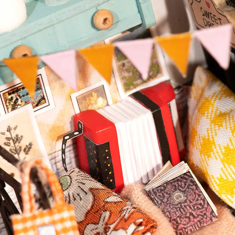 This bedroom miniature dollhouse kit is small but super adorable & cozy. Feel free to create a sweet bedroom scene in the way you want and have a good night’s sleep in here. You are going to love it!