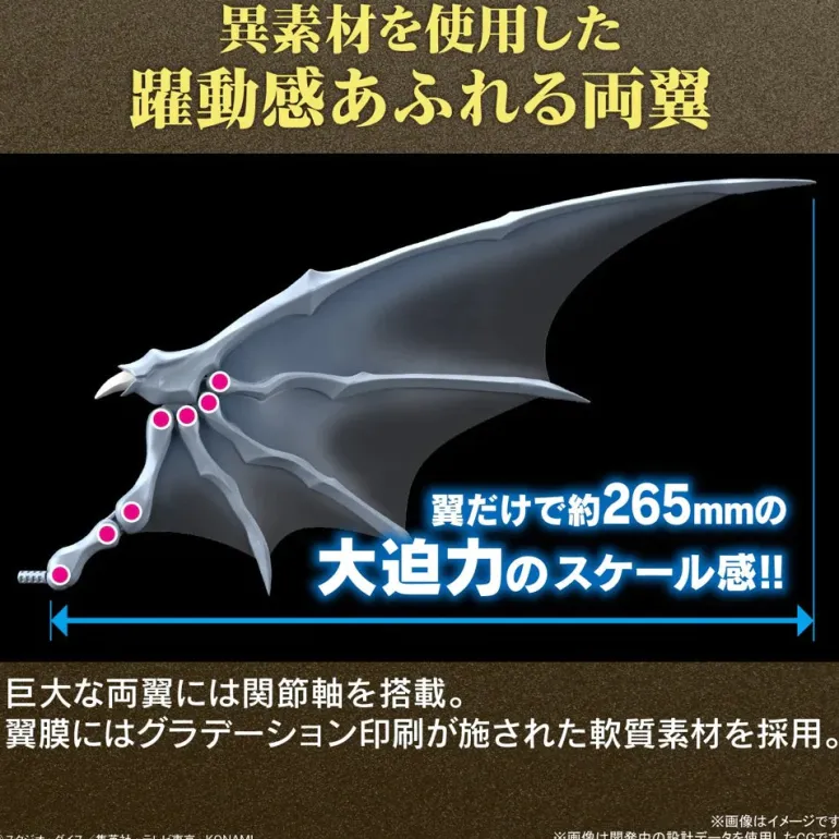 The charm of the character has been “amplified” with a new interpretation of the design arrangement unique to the plastic model. A metallic blue color has been used for the molding to make the monster feel more epic, and its huge wings, each measuring about 265mm in length, are equipped with joint axes for posability.
